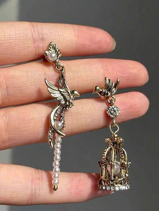 Vintage Asymmetric Bird Cage Faux Pearl Earrings, Suitable For Any Occasion