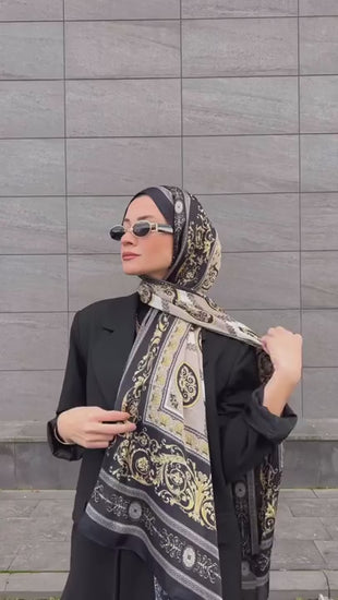 Black Luxurious Fashion Palace Print Scarf Vintage Satin Shawl Imitation Silk Head Wrap Hijab Casual Sunscreen Windproof