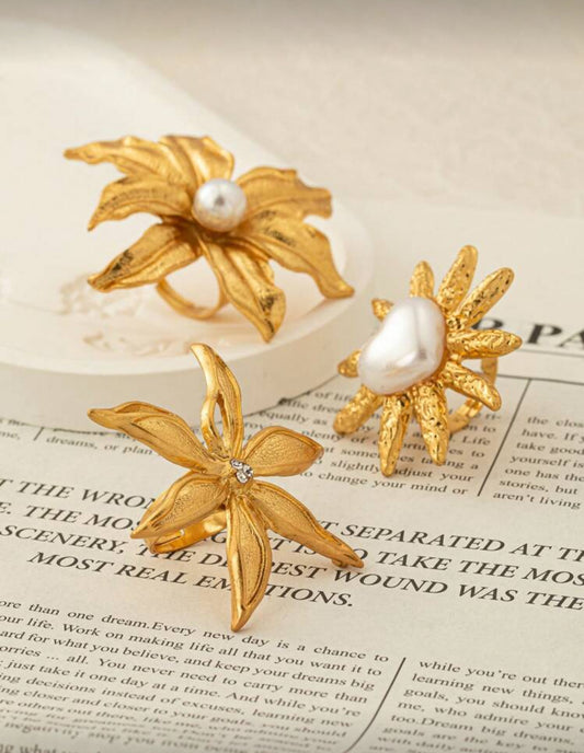 3 Pcs Golden Color Chunky Flower Rings Set For Women Spring Floral Ring Summer Boho Jewelry