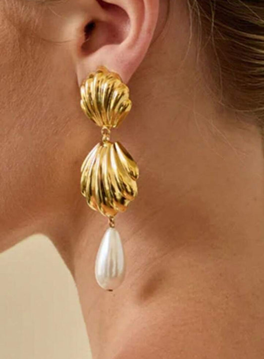 Vacation Fan Earrings, Shell Element Alloy Faux Pearl Water Droplet Pendant Earrings