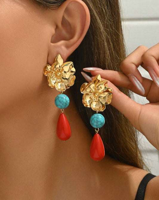 Vintage Bohemian Metal Flower Petal Golden Stamen, Ripple Ceramic Pendant And Asymmetrical Blue Resin Block Combo Earrings