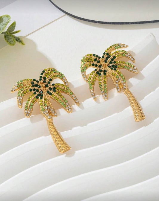 Creative Colorful Metal Rhinestone Palm Tree Style Earrings For Women, Suitable For Vacation