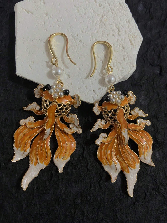 2pcs Elegant Alloy Enamel Koi Fish Design Oversized Hoop Earrings, Vintage Handpainted Pearl Jewelry For Women