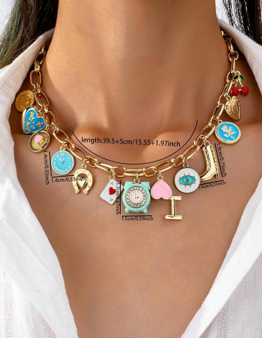 Enameled Cherry Heart Multiple Charms Necklace