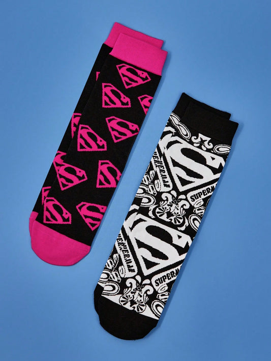 SUPERMAN 2 Pairs Unisex Breathable & Moisture-Wicking Crew Socks With Reinforced Toe And Heel, Superhero Logo Design, Suitable For All Seasons, Black And Pink