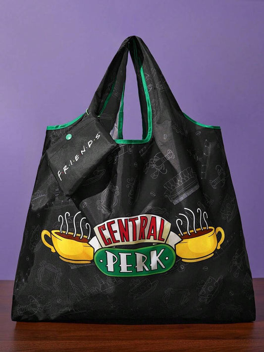 FRIENDS 1pc Coffee Cup Pattern Printed Polyester Foldable Shopping Bag, Tote Bag, Equipped With A Small Storage Bag With A Bead Chain,Gift,Friends,Central Perk,gift