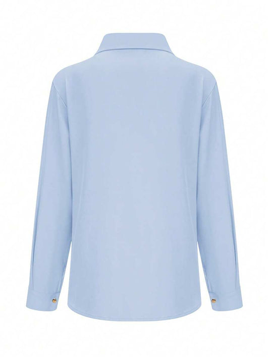 Fashion Women Asymmetrical Button Blue Shirt, Minimalist Style Casual Daily Wear