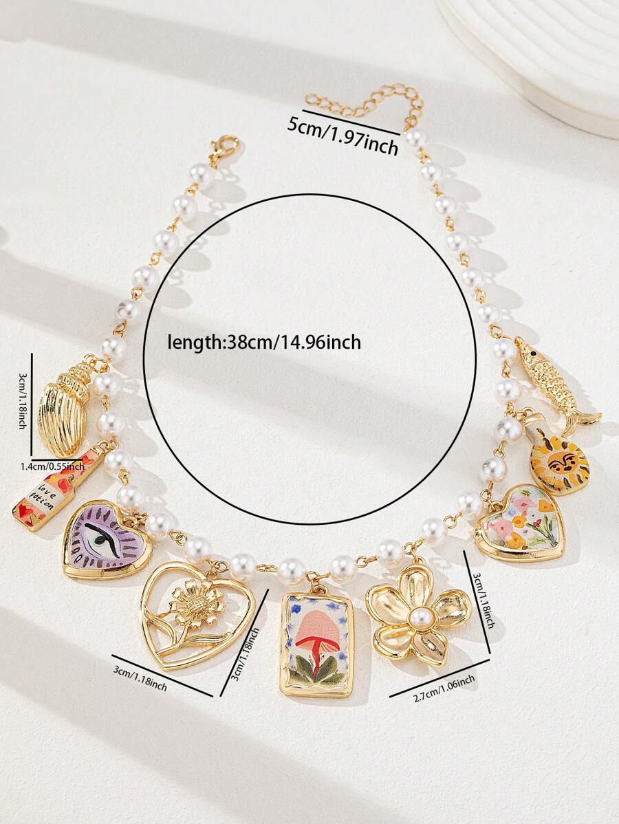 Heart Locket, Cherry, Cowboy Hat, Boots, Bow, Key Multi Charm Necklace, Boho Faux Pearl Beaded Necklace With Charms