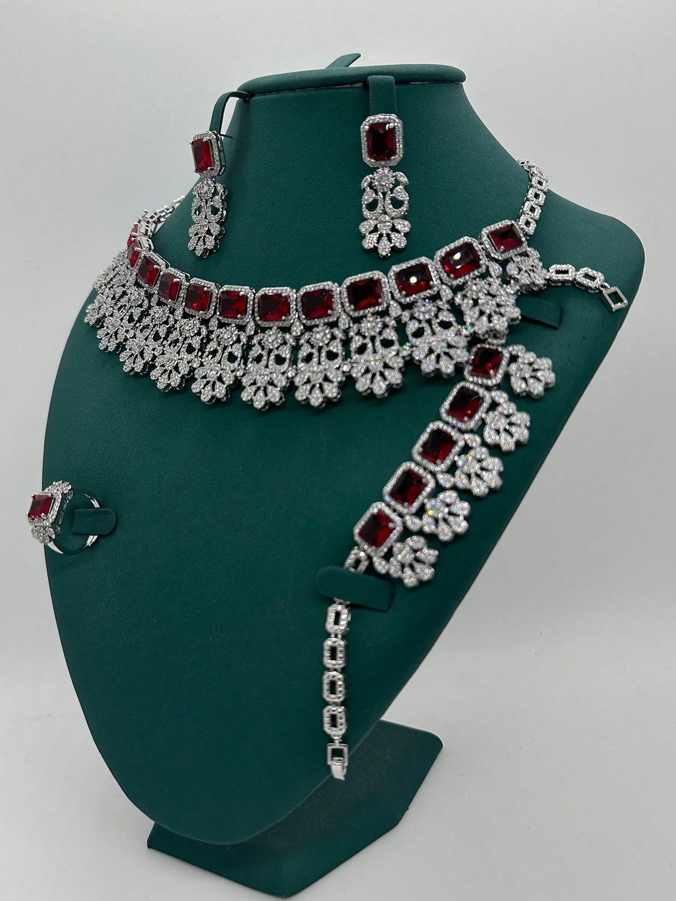 5pcs/Set Luxury European & American Style Exaggerated Ruby, Emerald, Cubic Zirconia Copper Necklace, Earrings, Open Ring, Bracelet Jewelry Set. Suitable For Banquet, Party, Bride, Wedding. Gift For Mother, Teacher, Girlfriend