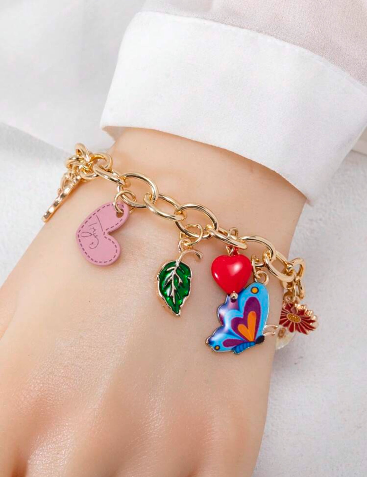 Bracelet With Multiple Charms Including Butterfly, Flower, Heart, Leaf, Cherry, Bear, Epoxy Resin
