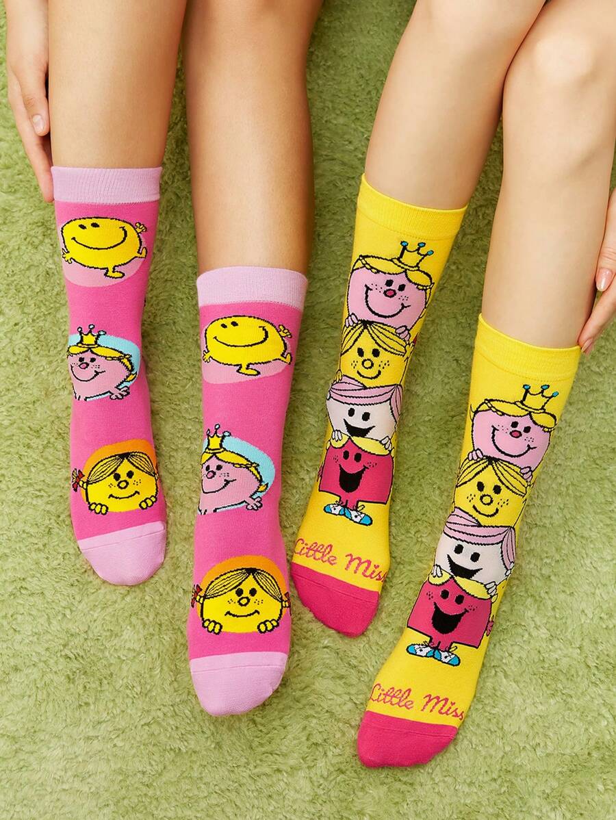 Mr Men Little Miss Unisex 2 Pairs Women's Cartoon Printed Mid-Calf Socks