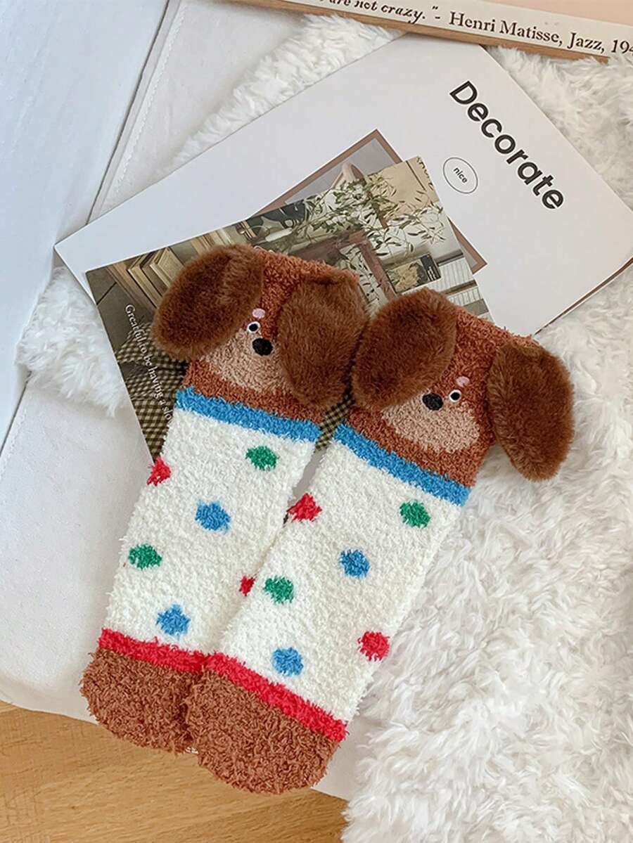 Women's Thick Blue Coral Fleece Sausage Dog Fuzzy Slipper Socks, Warm Plush Floor Socks, Cozy Sleeping Socks, Japanese Style Coral Fleece Cartoon Embroidered