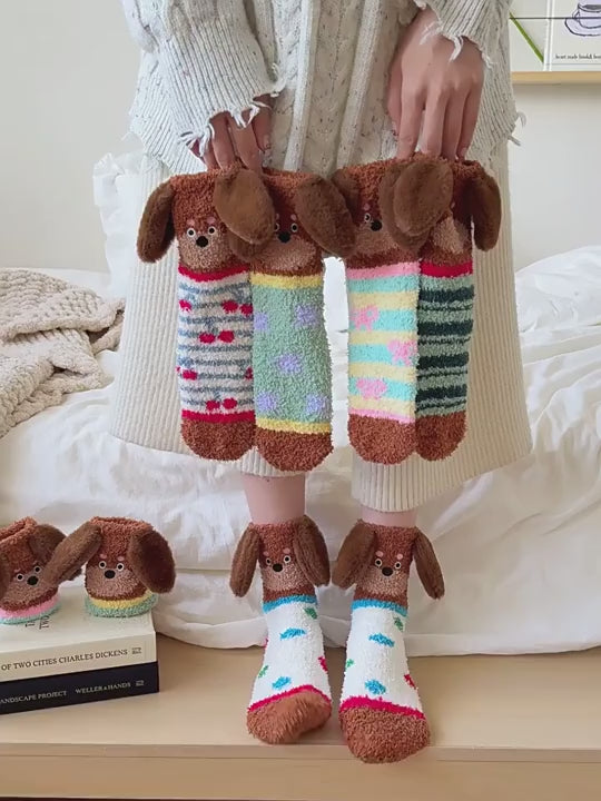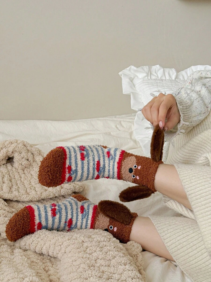 Women's Thick RED Coral Fleece Sausage Dog Fuzzy Slipper Socks, Warm Plush Floor Socks, Cozy Sleeping Socks, Japanese Style Coral Fleece Cartoon Embroidered